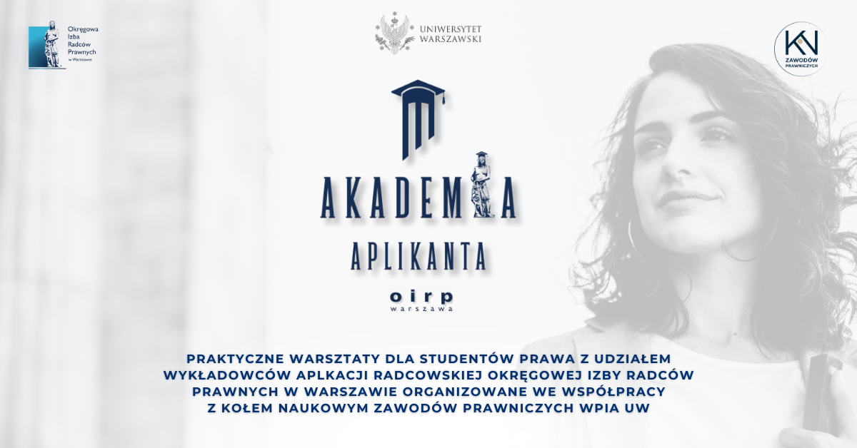 Koło Naukowe Zawodów Prawniczych zaprasza na cykl warsztatów organizowanych we współpracy z Okręgową Izbą Radców Prawnych w Warszawie pt. „Akademia Aplikanta”, które odbędą się 12 marca i 24 kwietnia 2024 r.