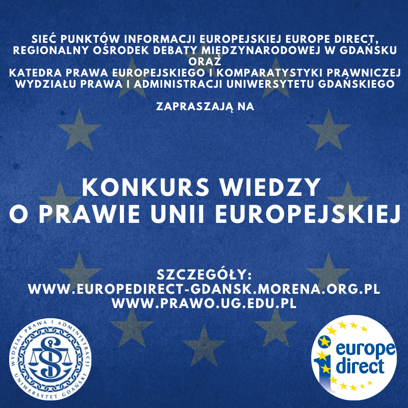 Punkt Informacji Europejskiej Europe Direct – Gdańsk oraz Katedra Prawa Europejskiego i Komparatystyki Prawniczej Wydziału Prawa i Administracji Uniwersytetu Gdańskiego zaprasza na Konkurs wiedzy o prawie Unii Europejskiej skierowany do studentów uczelni wyższych na kierunkach: