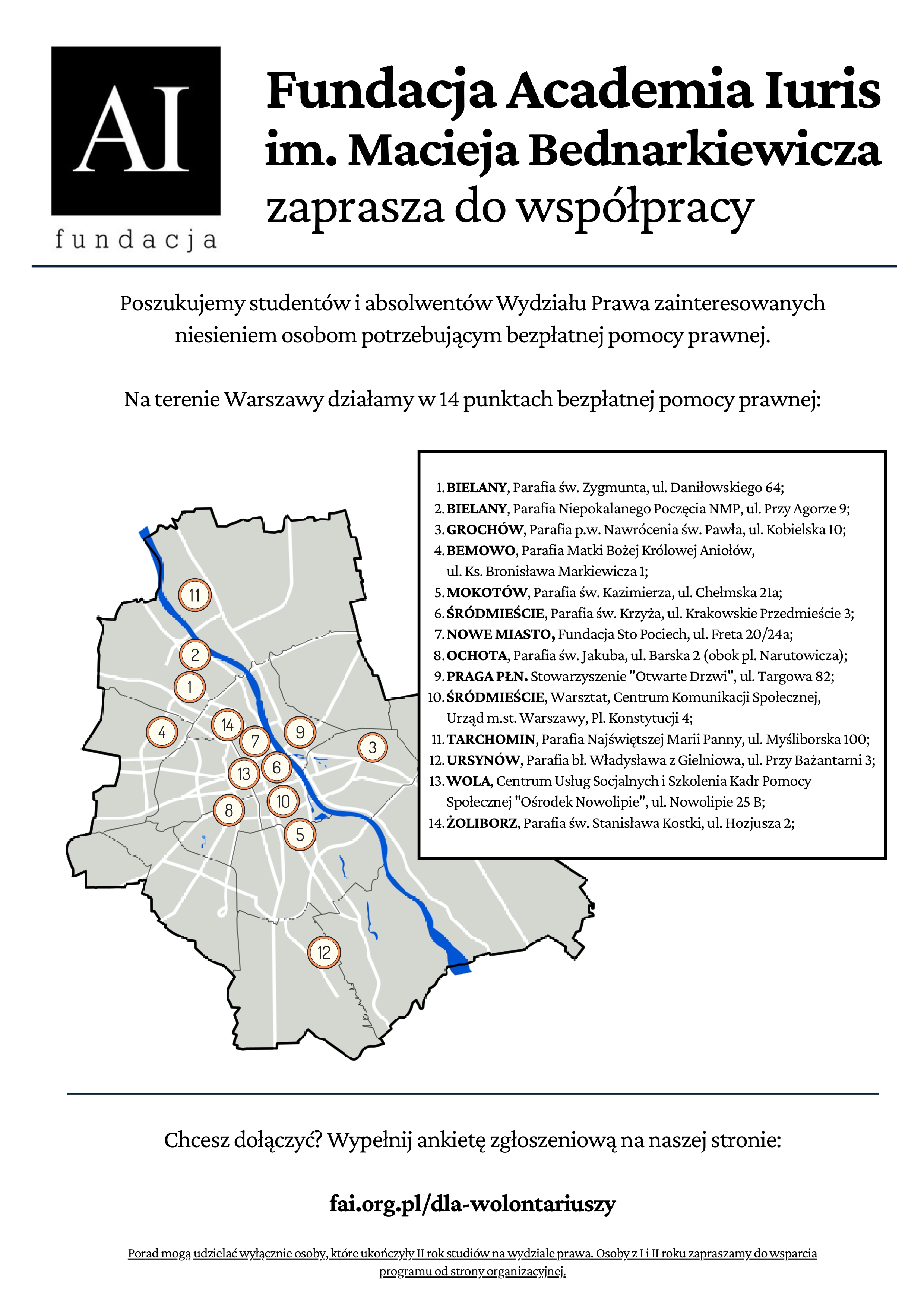 FUNDACJA ACADEMIA IURIS zaprasza Studentów Wydziału Prawa i Administracji UW do udziału w programie bezpłatnej pomocy prawnej. Zgłoszenia można przesyłać za pośrednictwem strony internetowej: https://www.academiaiuris.pl/dla-wolontariuszy