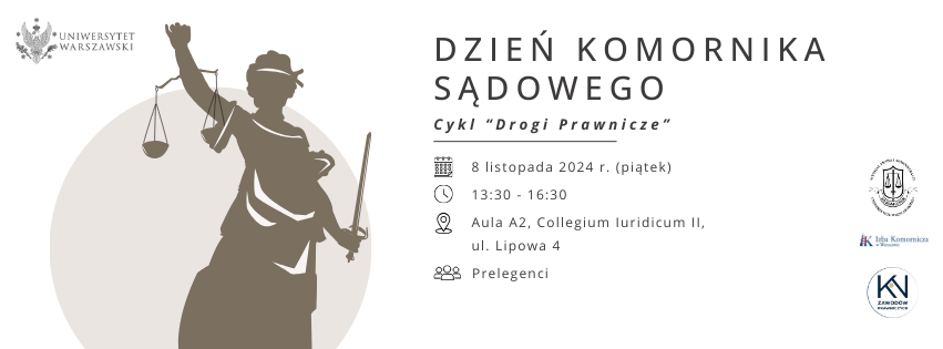 Wydział Prawa i Administracji Uniwersytetu Warszawskiego wraz z Kołem Naukowym Zawodów Prawniczych WPiA UW zapraszają na pierwsze z pięciu spotkań z cyklu „Drogi Prawnicze” – Dzień Komornika Sądowego, które odbędzie się 8 listopada 2024 roku w godz. 13:30-16:30 w auli A2, Collegium Iuridicum II, przy ul. Lipowej 4.