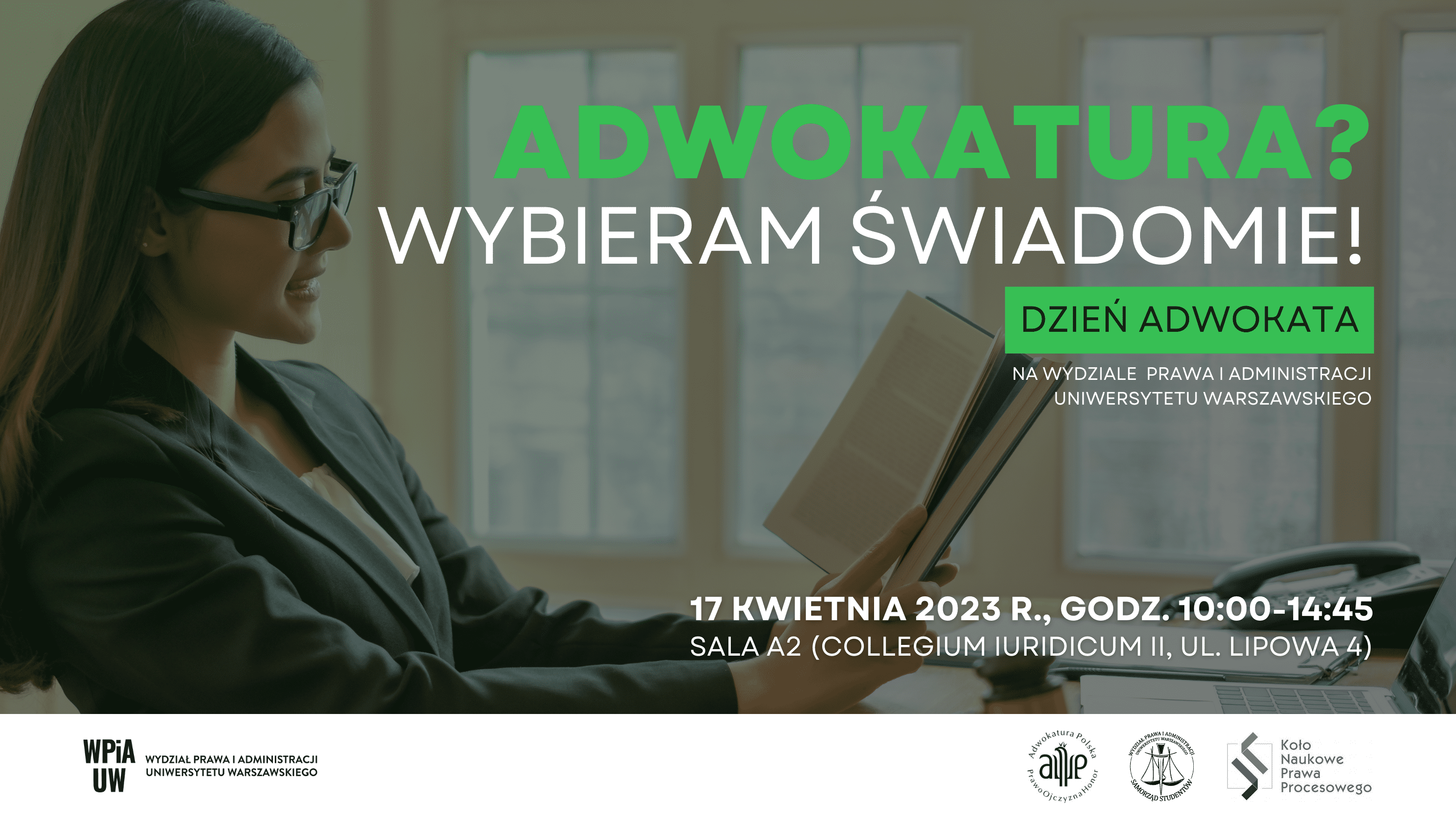 Wydział Prawa i Administracji Uniwersytetu Warszawskiego wraz z Naczelną Radą Adwokacką, Samorządem Studentów WPiA UW oraz Kołem Naukowe Prawa Procesowego WPiA UW mają zaszczyt zaprosić do udziału w Dniu Adwokata. Wydarzenie odbędzie się 17 kwietnia w auli A.2 w Collegium Iuridicum II przy ul. Lipowej 4 w godz. 10:00 - 14:45.