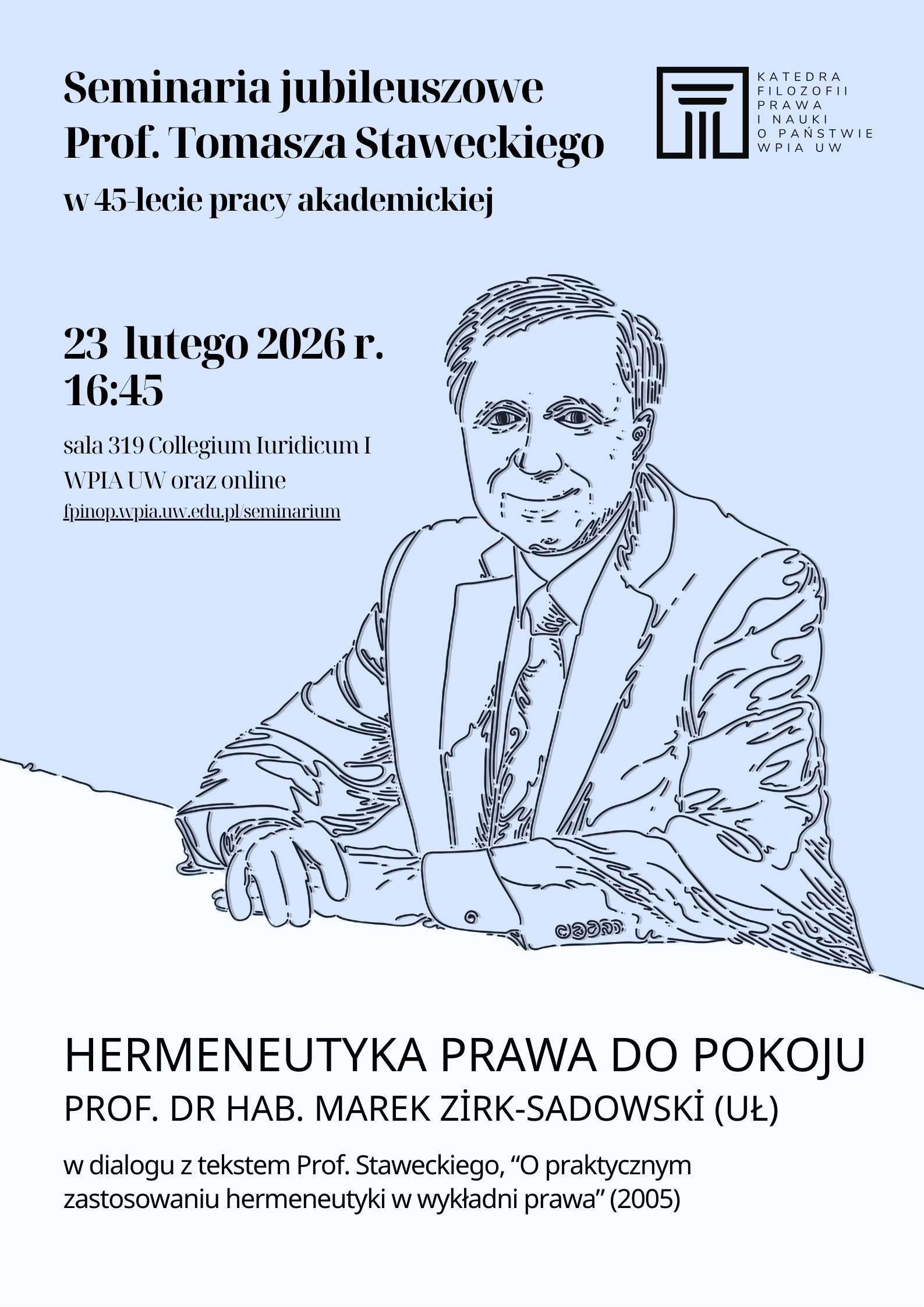 Katedra Filozofii Prawa i Nauki o Państwie zaprasza do udziału w cyklu seminariów jubileuszowych, w czasie których punktem wyjścia do dyskusji będą zagadnienia i problemy badawcze podejmowane przez Jubilata na przestrzeni lat pracy naukowej. Dialog z wybranymi tekstami Prof. Tomasza Staweckiego podejmą w swoich referatach znakomici przedstawiciele rodzimej teorii i filozofii prawa!