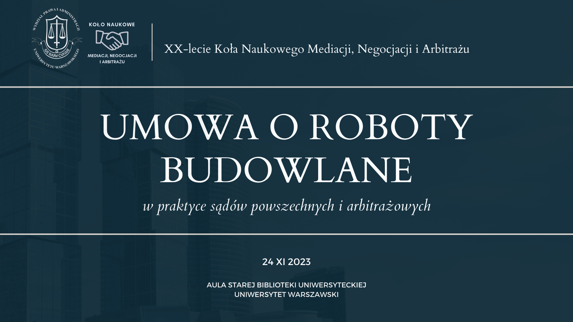 Konferencja naukowa “Umowa o roboty budowlane w praktyce sądów powszechnych i arbitrażowych” organizowana przez Wydział Prawa i Administracji Uniwersytetu Warszawskiego, Katedrę Postępowania Cywilnego oraz Koło Naukowe Mediacji Negocjacji i Arbitrażu, odbędzie się 24 listopada br. (piątek) w godz. 9:00-17:30 w Auli Starej Biblioteki Uniwersyteckiej. Wydarzenie będzie miało charakter hybrydowy - stacjonarnie oraz transmisja online. Konferencja objęta jest patronatem Sądu Arbitrażowego przy Krajowej Izbie Gospodarczej oraz patronatem medialnym portalu prawo.pl. Wydarzenie odbędzie się dzięki wsparciu partnerów konferencji - kancelarii prawnych: CMS, DZP, Dentons oraz Łaszczuk i Wspólnicy.