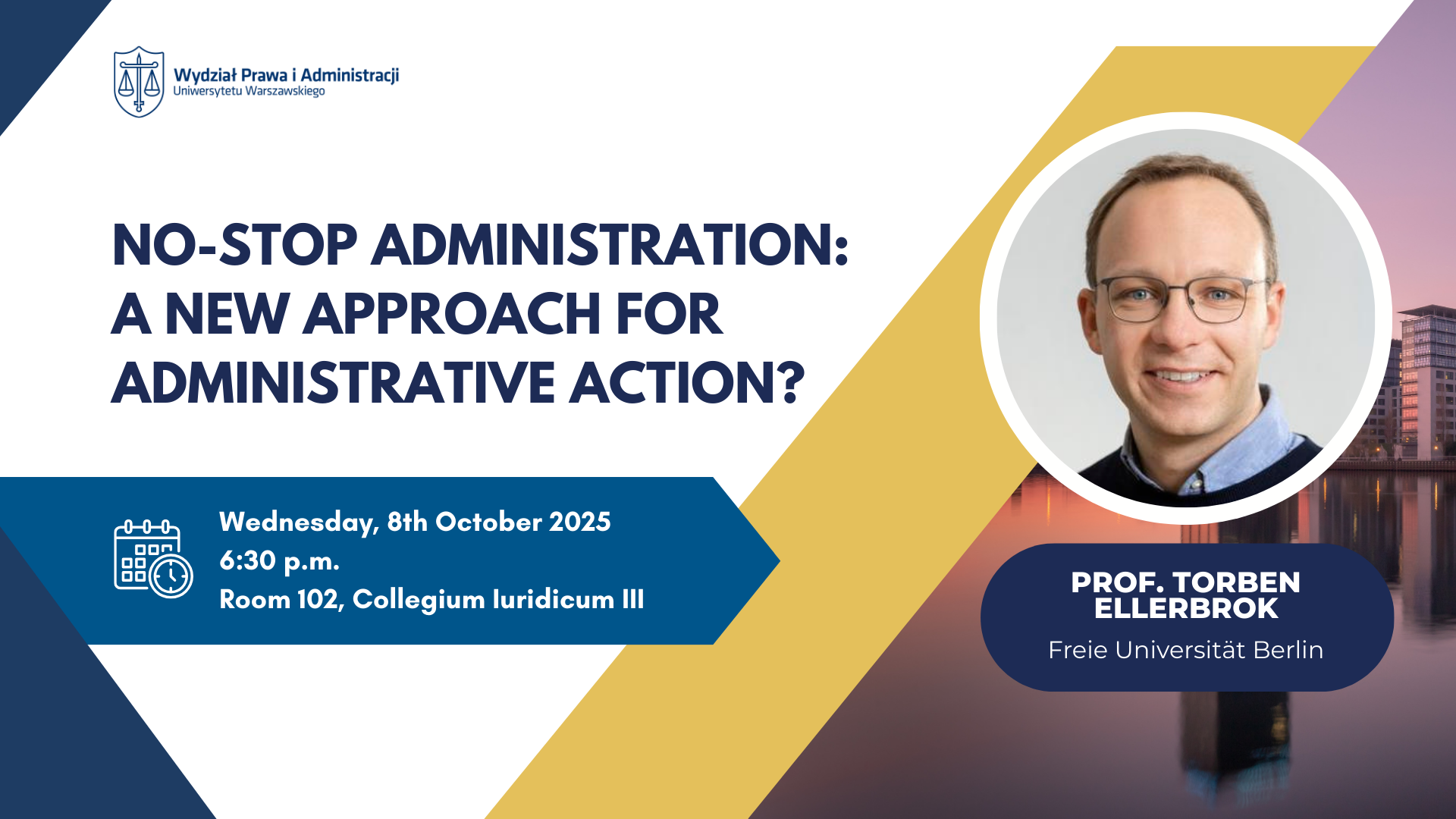 Zakład Studiów nad Dobrym Rządzeniem - Good Governance zaprasza na otwarte seminarium doktoranckie, podczas którego wprowadzenie do dyskusji pt. "No-stop administration: a new approach for administrative action?" wygłosi prof. Torben Ellerbrok (Freie Universität Berlin, specjalizujący się w prawie administracyjnym i europejskim, ze szczególnym uwzględnieniem cyfryzacji administracji i kontroli sądowej jej działań). Spotkanie poświęcone będzie wyzwaniom „administracji bez przestojów” (ciągłość działania, digitalizacja usług publicznych, ramy prawne i gwarancje procesowe).