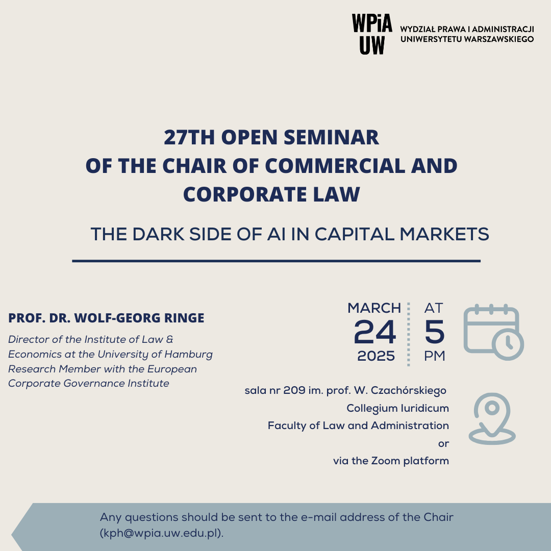 Open Seminar OF THE CHAIR OF COMMERCIAL AND CORPORATE LAW during which the paper titled: „The Dark Side of AI in Capital Markets”