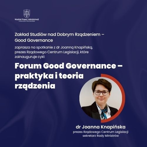 Zakład Studiów nad Dobrym Rządzeniem – Good Governance zaprasza na spotkanie z dr Joanną Knapińską, prezes Rządowego Centrum Legislacji, które zainauguruje cykl „Forum Good Governance – praktyka i teoria rządzenia”. Celem wydarzenia jest stworzenie przestrzeni do refleksji nad współczesnymi wyzwaniami procesu legislacyjnego oraz rolą instytucji rządowych w kształtowaniu polityk publicznych. Spotkanie ma charakter otwarty.