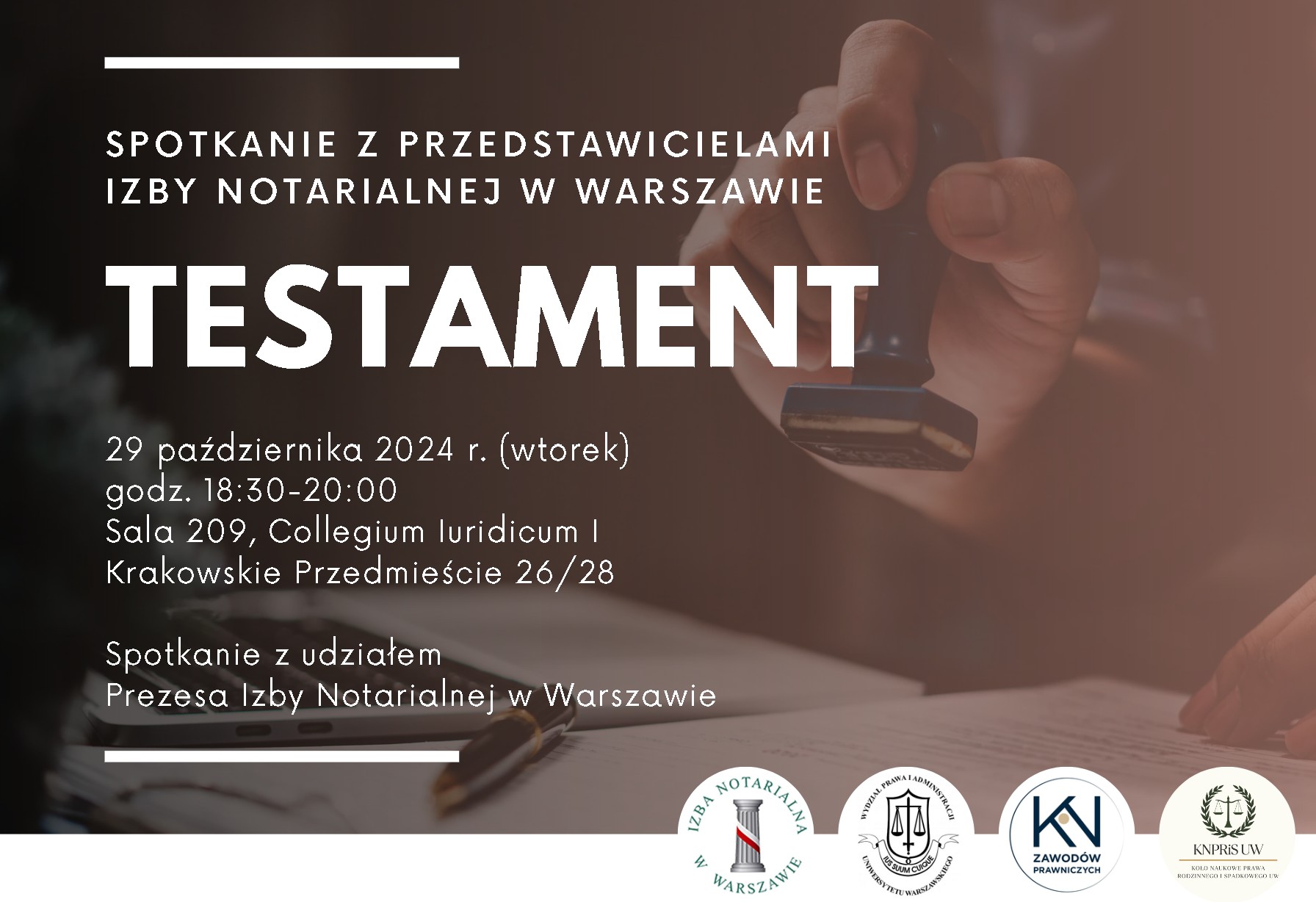 Wydział Prawa i Administracji UW wraz z Kołem Naukowym Zawodów Prawniczych WPiA UW oraz Kołem Naukowym Prawa Rodzinnego i Spadkowego UW we współpracy z Izbą Notarialną w Warszawie zapraszają na spotkanie poświęcone problematyce sporządzania testamentów – 29 października 2024 r. (wtorek) godz. 18:30 – 20:00 w sali 209 Collegium Iuridicum I (Stary Wydział).