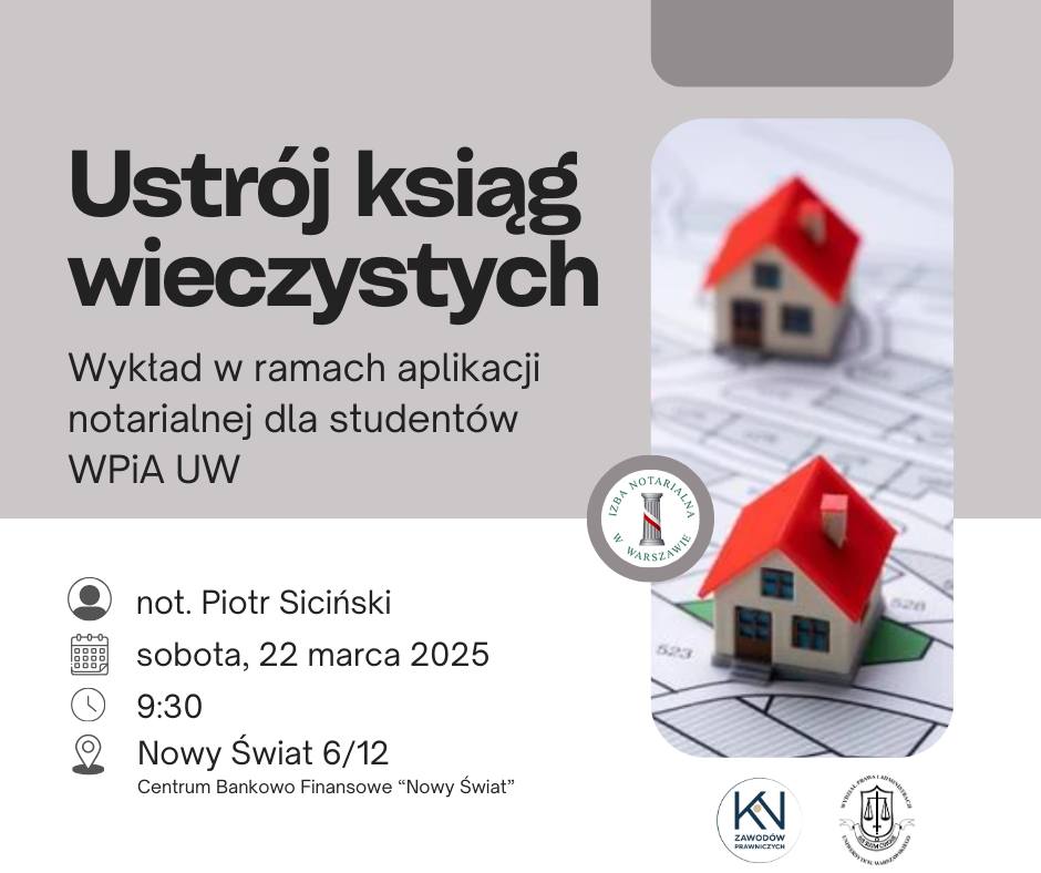 Wydział Prawa i Administracji Uniwersytetu Warszawskiego wraz z Kołem Naukowym Zawodów Prawniczych WPiA UW zapraszają do udziału w zajęciach na aplikacji notarialnej organizowanych we współpracy z Izbą Notarialną w Warszawie. To niepowtarzalna okazja dla Studentów i Studentek WPiA UW, aby przekonać się, jak wyglądają zajęcia na aplikacji zawodowej (wraz z aplikantami notarialnymi).