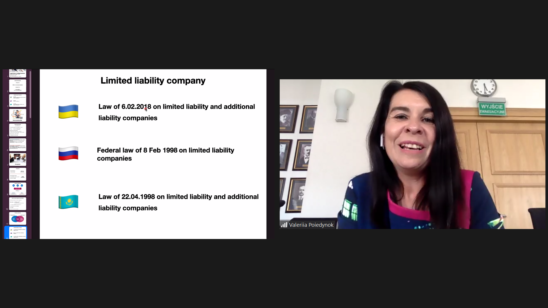- 21-22 maja, prof. dr. habil. Valeria Poiedynok z Kijowskiego Uniwersytetu Narodowego im. Tarasa Szewczenki, "Legal forms of doing business in post-soviet countries"